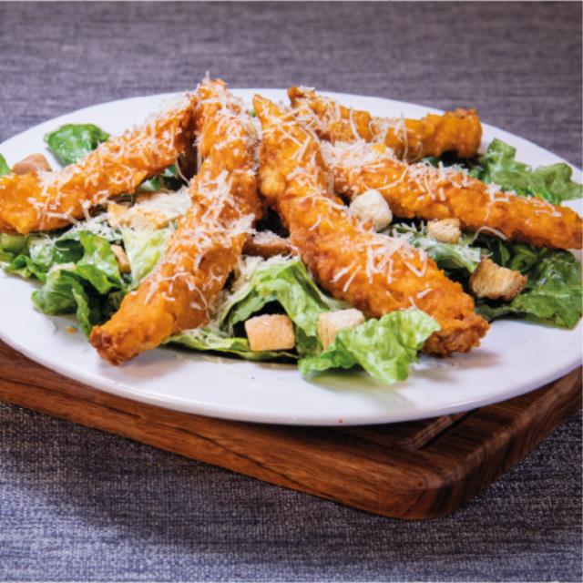 Nuestra tradicional ensalada César coronada con 220 g de tiras de pechuga de pollo fritas y enharinadas, bañadas con tu elección.
